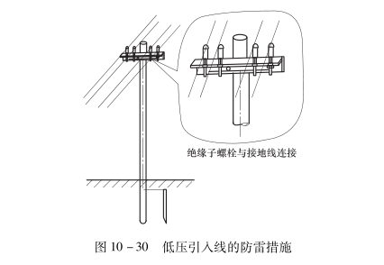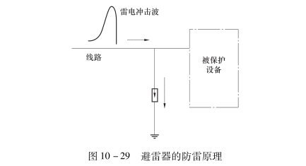 ? ? ? ?配電架空線路受到雷擊時,雷電沖擊波就向?qū)Ь€兩端流動,這種流動的沖擊波又稱為進行波。為了保護與線路連接的電氣設(shè)備不受進行波的沖擊,在10kV及以下的配電系統(tǒng)中,主要依靠閥型避雷器作為防雷措施,如圖10-29所示。